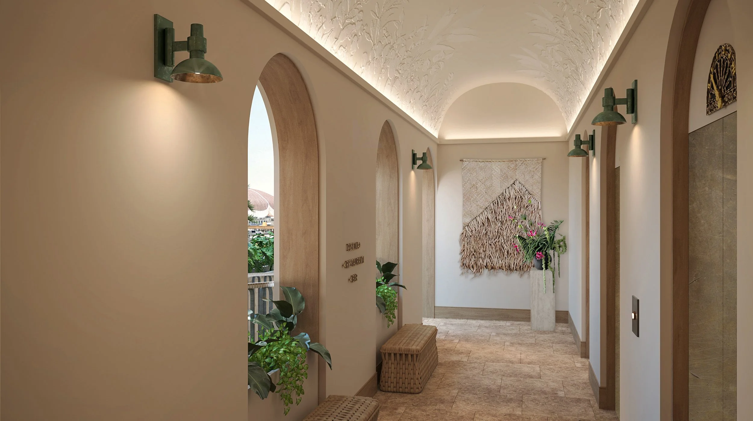 A rooftop garden bar, with its combination of lush gardening and modern design, demonstrates a urban oasis and respite from the city streets reminiscent of a Mediterranean retreat. Playful colors and patterns alongside natural rattan and terracotta textures create an eclectic Caribbean atmosphere.